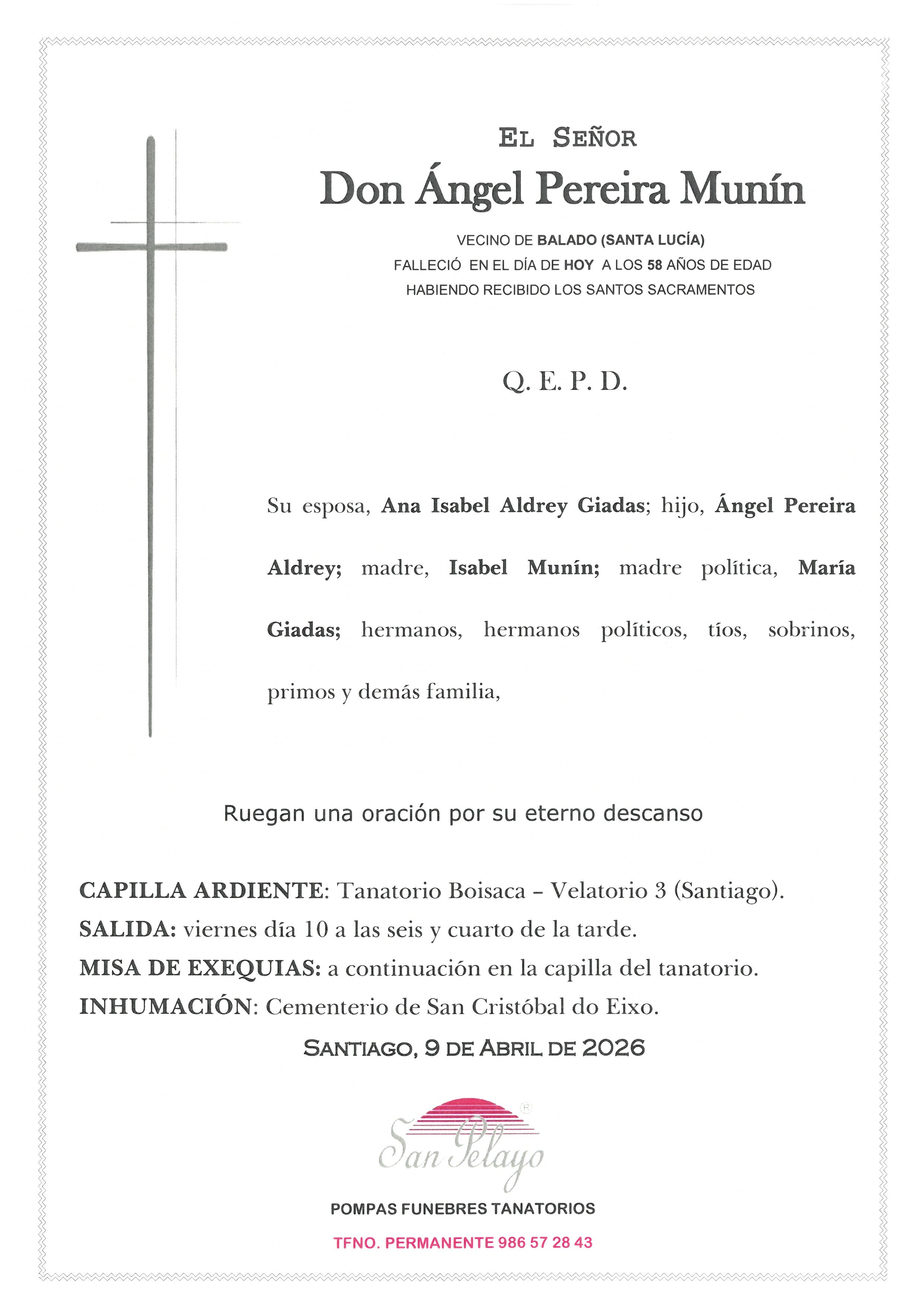 ANGEL PEREIRA MUNIN Tanatorio ExternoCONSULTAR SALA 986 572 843 09/04/202610/04/2026 Archivos adjuntos S18111722440.jpg Eventos Tanatorio Tanatorio Municipal de Santiago Rua das Mulas, Pol. Ind. Boisaca - Santiago de Compostela(ver en mapa) Iglesia y cementerio San Cristobal do Eixo Rua Igrexario - Santiago de Compostela(ver en mapa) Enviar pésameSu mensaje llegará a la familia del fallecido Pésame para la familia de ANGEL PEREIRA MUNIN Selecciona un mensaje de pésame para cargarlo El motivo de este mensaje es expresarle mis más profundas condolencias por el reciente fallecimiento. Deseo que su alma descanse en paz y que encuentren pronto la resignación por tan enorme pérdida. Nos ha impresionado el reciente fallecimiento. Le acompañamos en su sentimiento ante tan irreparable pérdida. Apenas me acabo de enterar del lamentable fallecimiento. Dios le ayude a soportar tan gran ausencia. Siento sinceramente el reciente fallecimiento. Le envío un fuerte abrazo. Les envío mi más sentido pésame. Les acompaño en su dolor. Una gran persona, ejemplo vital para otras muchas; que su recuerdo permanezca y su trayectoria sea recordada. Condolencias a toda la familia. Mostrar pésames más habituales El titular de la página informa que los datos de este formulario serán tratados para ofrecerle la información solicitada, siendo la base legal del tratamiento el consentimiento otorgado por el usuario. No se cederán datos a terceros. Puede ejercer los derechos como se explica en la Política de Privacidad. Defunción ANGEL PEREIRA MUNIN. Esquela, ubicación tanatorio, funeraria, horarios iglesia y cementerio. Envío de pesames online y servicio de floristería (flores, ramos, coronas, centros florales..) para enviar un último recuerdo y condolencias a la familia de ANGEL PEREIRA MUNIN. Información sobre las misas y el entierro del difunto así como del velatorio y la capilla ardiente.
