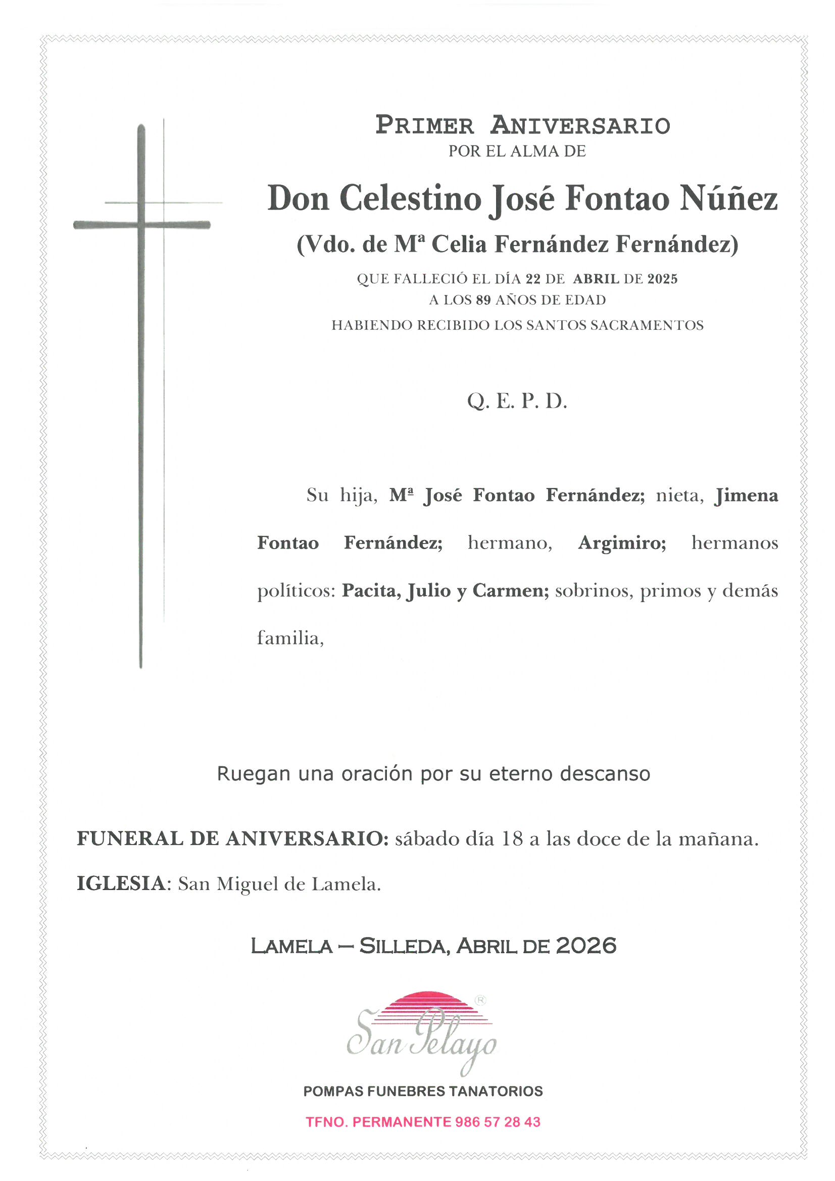ANIV: CELESTINO JOSÉ FONTAO NÚÑEZ 18/04/2026