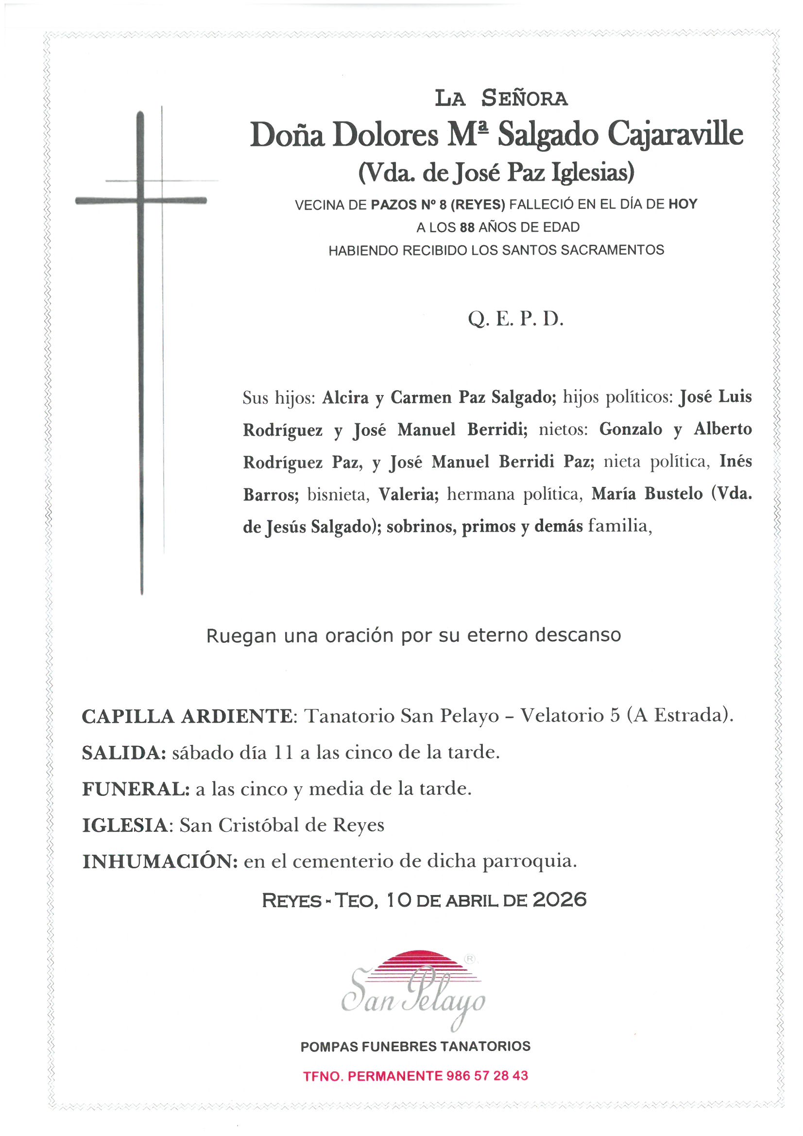 DOLORES Mª SALGADO CAJARAVILLE Funeraria San Pelayo - A EstradaSALA 05 Figueroa de Arriba, 53 Bajo - 36681 A Estrada(ver en mapa) 986 572 843 10/04/202611/04/2026 Archivos adjuntos SOlivetti M26041015110.jpg Eventos 11/04/202617:30 Iglesia y cementerio San Cristobal de Reis Camiño da Iglesia - Teo(ver en mapa) Enviar pésameSu mensaje llegará a la familia del fallecido Pésame para la familia de DOLORES Mª SALGADO CAJARAVILLE Selecciona un mensaje de pésame para cargarlo El motivo de este mensaje es expresarle mis más profundas condolencias por el reciente fallecimiento. Deseo que su alma descanse en paz y que encuentren pronto la resignación por tan enorme pérdida. Nos ha impresionado el reciente fallecimiento. Le acompañamos en su sentimiento ante tan irreparable pérdida. Apenas me acabo de enterar del lamentable fallecimiento. Dios le ayude a soportar tan gran ausencia. Siento sinceramente el reciente fallecimiento. Le envío un fuerte abrazo. Les envío mi más sentido pésame. Les acompaño en su dolor. Una gran persona, ejemplo vital para otras muchas; que su recuerdo permanezca y su trayectoria sea recordada. Condolencias a toda la familia. Mostrar pésames más habituales El titular de la página informa que los datos de este formulario serán tratados para ofrecerle la información solicitada, siendo la base legal del tratamiento el consentimiento otorgado por el usuario. No se cederán datos a terceros. Puede ejercer los derechos como se explica en la Política de Privacidad. Defunción DOLORES Mª SALGADO CAJARAVILLE. Esquela, ubicación tanatorio, funeraria, horarios iglesia y cementerio. Envío de pesames online y servicio de floristería (flores, ramos, coronas, centros florales..) para enviar un último recuerdo y condolencias a la familia de DOLORES Mª SALGADO CAJARAVILLE. Información sobre las misas y el entierro del difunto así como del velatorio y la capilla ardiente.