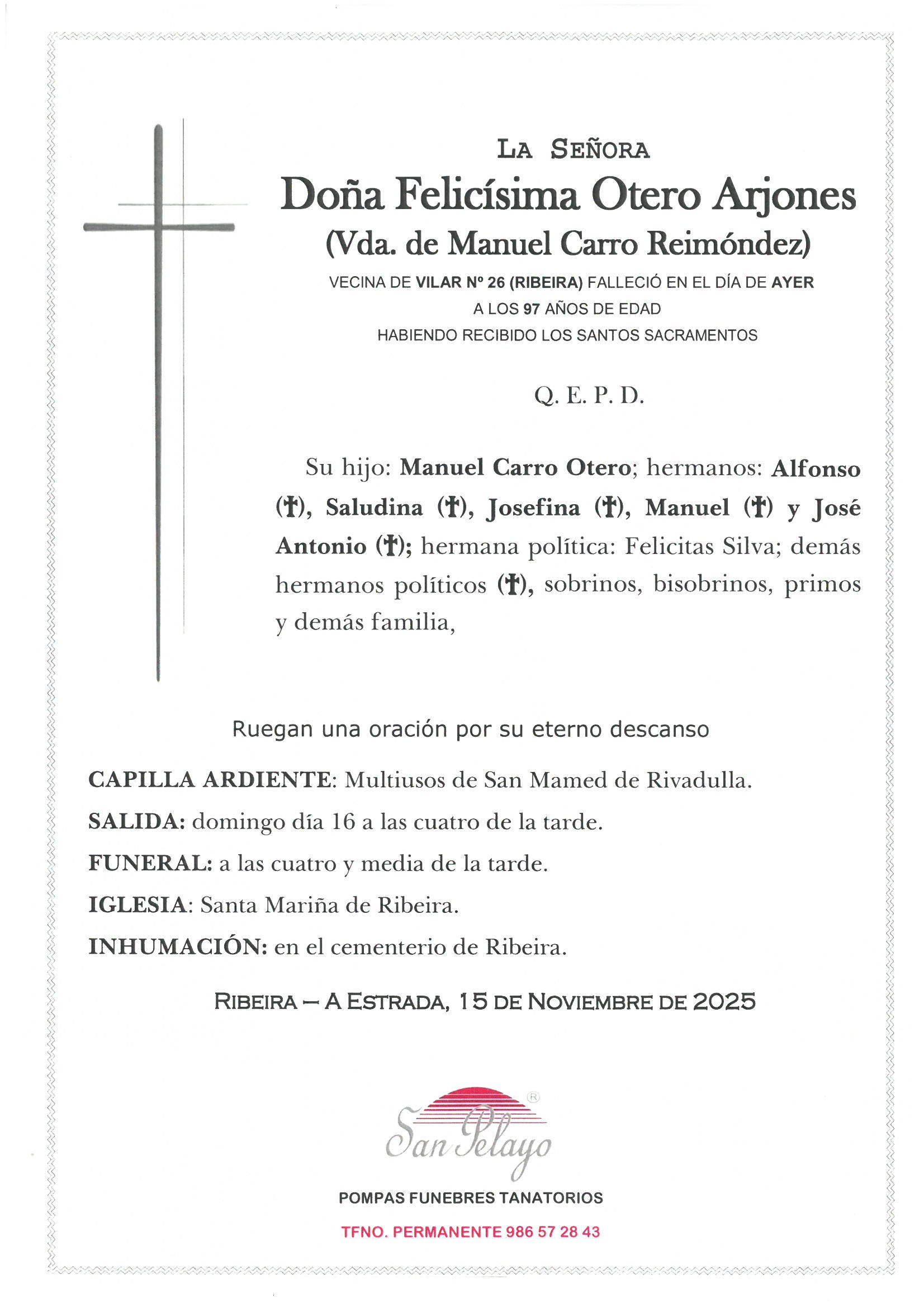 FELICÍSIMA OTERO ARJONES Tanatorio ExternoCONSULTAR SALA 986 572 843 15/11/202516/11/2025 Archivos adjuntos SOlivetti M25111511360.jpg Eventos 15/11/202511:15 Tanatorio Multiusos de Mamed de Ribadulla San Mamed de Ribadulla - Vedra(ver en mapa) 16/11/202516:30 Iglesia y cementerio Santa Mariña de Ribeira O Pazo - A Estrada(ver en mapa) Enviar pésameSu mensaje llegará a la familia de la persona fallecida Pésame para la familia de FELICÍSIMA OTERO ARJONES Selecciona un mensaje de pésame para cargarlo El motivo de este mensaje es expresarle mis más profundas condolencias por el reciente fallecimiento. Deseo que su alma descanse en paz y que encuentren pronto la resignación por tan enorme pérdida. Nos ha impresionado el reciente fallecimiento. Le acompañamos en su sentimiento ante tan irreparable pérdida. Apenas me acabo de enterar del lamentable fallecimiento. Dios le ayude a soportar tan gran ausencia. Siento sinceramente el reciente fallecimiento. Le envío un fuerte abrazo. Les envío mi más sentido pésame. Les acompaño en su dolor. Una gran persona, ejemplo vital para otras muchas; que su recuerdo permanezca y su trayectoria sea recordada. Condolencias a toda la familia. Mostrar pésames más habituales El titular de la página informa que los datos de este formulario serán tratados para ofrecerle la información solicitada, siendo la base legal del tratamiento el consentimiento otorgado por el usuario. No se cederán datos a terceros. Puede ejercer los derechos como se explica en la Política de Privacidad. Defunción FELICÍSIMA OTERO ARJONES. Esquela, ubicación tanatorio, funeraria, horarios iglesia y cementerio. Envío de pesames online y servicio de floristería (flores, ramos, coronas, centros florales..) para enviar un último recuerdo y condolencias a la familia de FELICÍSIMA OTERO ARJONES. Información sobre las misas y el entierro del difunto así como del velatorio y la capilla ardiente.