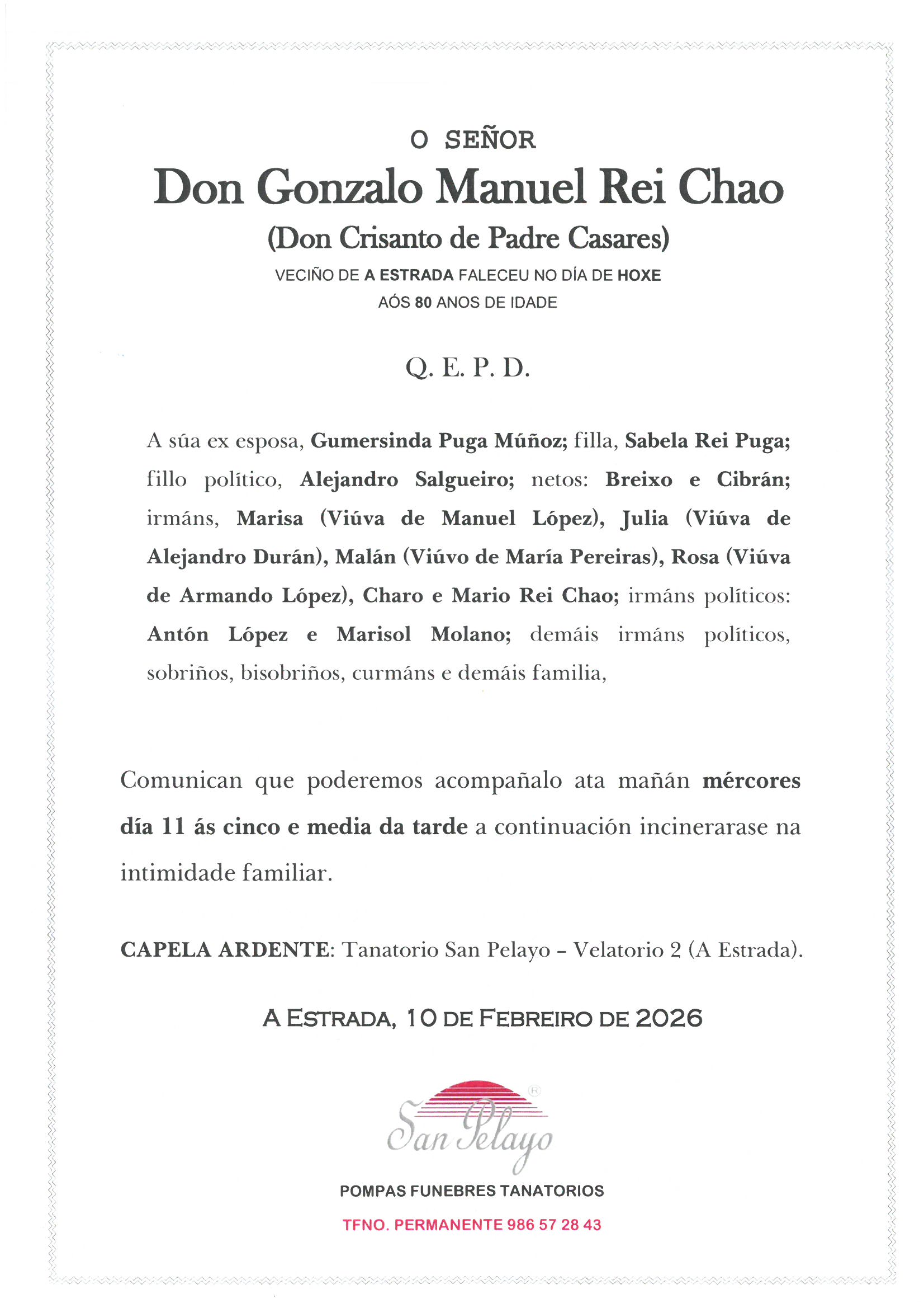 GONZALO MANUEL REI CHAO Funeraria San Pelayo - A EstradaSALA 02 Figueroa de Arriba, 53 Bajo - 36681 A Estrada(ver en mapa) 986 572 843 10/02/202611/02/2026 Archivos adjuntos SOlivetti M26021016260.jpg Enviar pésameSu mensaje llegará a la familia del fallecido Pésame para la familia de GONZALO MANUEL REI CHAO Selecciona un mensaje de pésame para cargarlo El motivo de este mensaje es expresarle mis más profundas condolencias por el reciente fallecimiento. Deseo que su alma descanse en paz y que encuentren pronto la resignación por tan enorme pérdida. Nos ha impresionado el reciente fallecimiento. Le acompañamos en su sentimiento ante tan irreparable pérdida. Apenas me acabo de enterar del lamentable fallecimiento. Dios le ayude a soportar tan gran ausencia. Siento sinceramente el reciente fallecimiento. Le envío un fuerte abrazo. Les envío mi más sentido pésame. Les acompaño en su dolor. Una gran persona, ejemplo vital para otras muchas; que su recuerdo permanezca y su trayectoria sea recordada. Condolencias a toda la familia. Mostrar pésames más habituales El titular de la página informa que los datos de este formulario serán tratados para ofrecerle la información solicitada, siendo la base legal del tratamiento el consentimiento otorgado por el usuario. No se cederán datos a terceros. Puede ejercer los derechos como se explica en la Política de Privacidad. Defunción GONZALO MANUEL REI CHAO. Esquela, ubicación tanatorio, funeraria, horarios iglesia y cementerio. Envío de pesames online y servicio de floristería (flores, ramos, coronas, centros florales..) para enviar un último recuerdo y condolencias a la familia de GONZALO MANUEL REI CHAO. Información sobre las misas y el entierro del difunto así como del velatorio y la capilla ardiente.