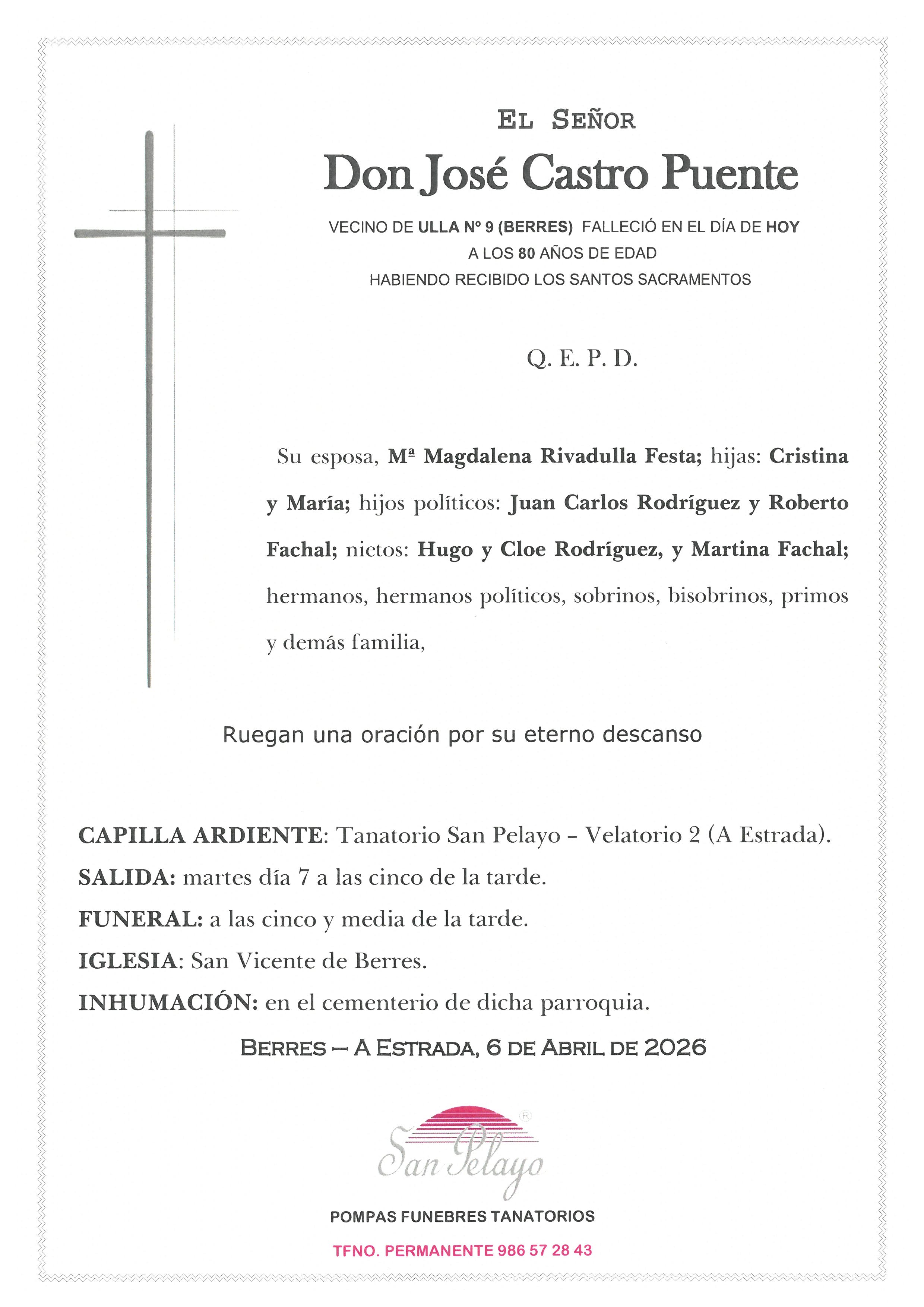 JOSÉ CASTRO PUENTE Funeraria San Pelayo - A EstradaSALA 02 Figueroa de Arriba, 53 Bajo - 36681 A Estrada(ver en mapa) 986 572 843 06/04/202607/04/2026 Archivos adjuntos S18111420220.jpg Eventos Iglesia y cementerio San Vicente de Berres A Ribeira, Berres - A Estrada(ver en mapa) Enviar pésameSu mensaje llegará a la familia del fallecido Pésame para la familia de JOSÉ CASTRO PUENTE Selecciona un mensaje de pésame para cargarlo El motivo de este mensaje es expresarle mis más profundas condolencias por el reciente fallecimiento. Deseo que su alma descanse en paz y que encuentren pronto la resignación por tan enorme pérdida. Nos ha impresionado el reciente fallecimiento. Le acompañamos en su sentimiento ante tan irreparable pérdida. Apenas me acabo de enterar del lamentable fallecimiento. Dios le ayude a soportar tan gran ausencia. Siento sinceramente el reciente fallecimiento. Le envío un fuerte abrazo. Les envío mi más sentido pésame. Les acompaño en su dolor. Una gran persona, ejemplo vital para otras muchas; que su recuerdo permanezca y su trayectoria sea recordada. Condolencias a toda la familia. Mostrar pésames más habituales El titular de la página informa que los datos de este formulario serán tratados para ofrecerle la información solicitada, siendo la base legal del tratamiento el consentimiento otorgado por el usuario. No se cederán datos a terceros. Puede ejercer los derechos como se explica en la Política de Privacidad. Defunción JOSÉ CASTRO PUENTE. Esquela, ubicación tanatorio, funeraria, horarios iglesia y cementerio. Envío de pesames online y servicio de floristería (flores, ramos, coronas, centros florales..) para enviar un último recuerdo y condolencias a la familia de JOSÉ CASTRO PUENTE. Información sobre las misas y el entierro del difunto así como del velatorio y la capilla ardiente.