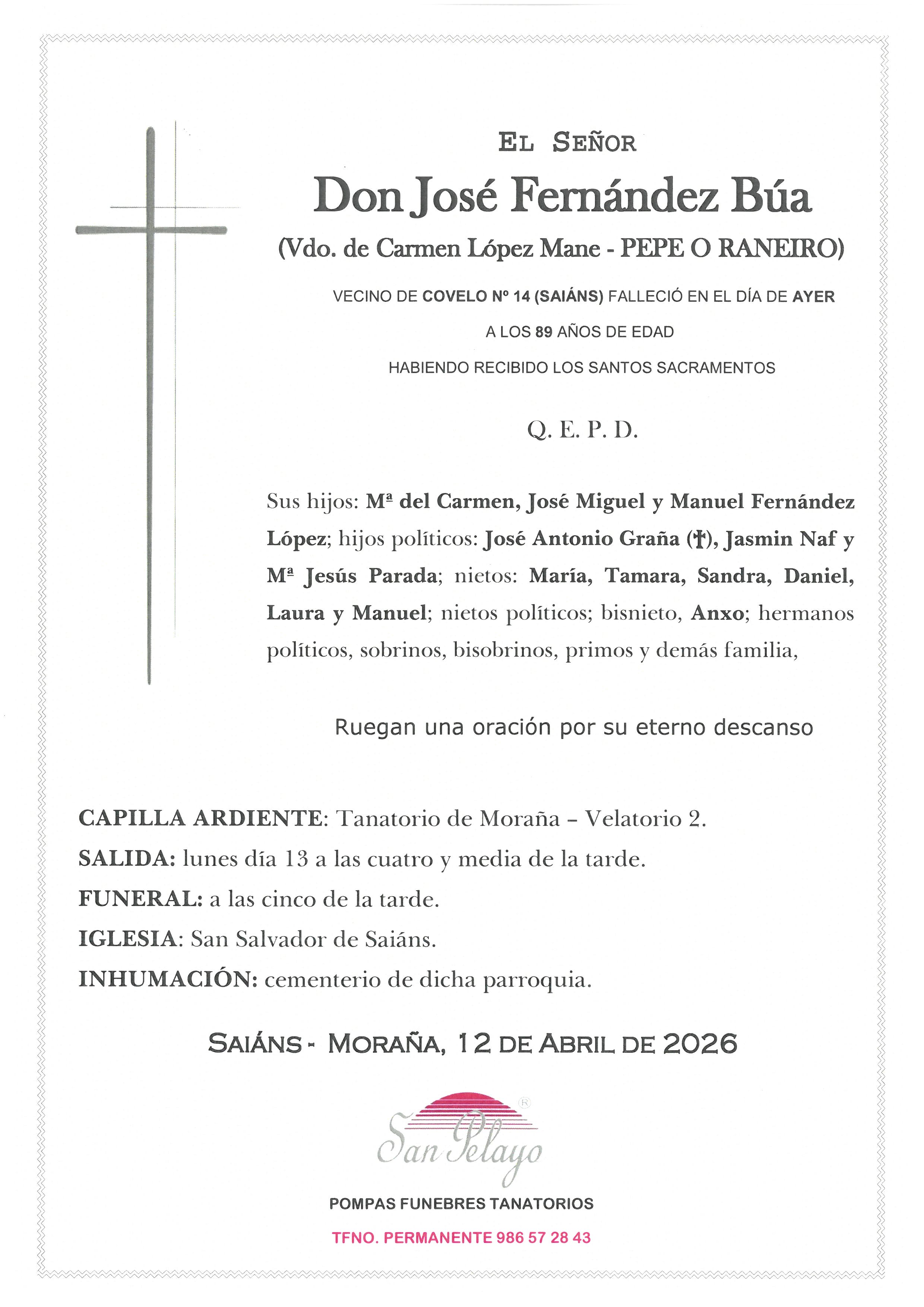 JOSE FERNANDEZ BUA Tanatorio ExternoCONSULTAR SALA 986 572 843 11/04/202613/04/2026 Archivos adjuntos S18112000150.jpg Eventos Tanatorio Tanatorio de Moraña Rua Doctor Batallan - Moraña(ver en mapa) Iglesia y cementerio San Salvador de Saians Soigrexa, 29, Saians - Moraña(ver en mapa) Enviar pésameSu mensaje llegará a la familia del fallecido Pésame para la familia de JOSE FERNANDEZ BUA Selecciona un mensaje de pésame para cargarlo El motivo de este mensaje es expresarle mis más profundas condolencias por el reciente fallecimiento. Deseo que su alma descanse en paz y que encuentren pronto la resignación por tan enorme pérdida. Nos ha impresionado el reciente fallecimiento. Le acompañamos en su sentimiento ante tan irreparable pérdida. Apenas me acabo de enterar del lamentable fallecimiento. Dios le ayude a soportar tan gran ausencia. Siento sinceramente el reciente fallecimiento. Le envío un fuerte abrazo. Les envío mi más sentido pésame. Les acompaño en su dolor. Una gran persona, ejemplo vital para otras muchas; que su recuerdo permanezca y su trayectoria sea recordada. Condolencias a toda la familia. Mostrar pésames más habituales El titular de la página informa que los datos de este formulario serán tratados para ofrecerle la información solicitada, siendo la base legal del tratamiento el consentimiento otorgado por el usuario. No se cederán datos a terceros. Puede ejercer los derechos como se explica en la Política de Privacidad. Defunción JOSE FERNANDEZ BUA. Esquela, ubicación tanatorio, funeraria, horarios iglesia y cementerio. Envío de pesames online y servicio de floristería (flores, ramos, coronas, centros florales..) para enviar un último recuerdo y condolencias a la familia de JOSE FERNANDEZ BUA. Información sobre las misas y el entierro del difunto así como del velatorio y la capilla ardiente.