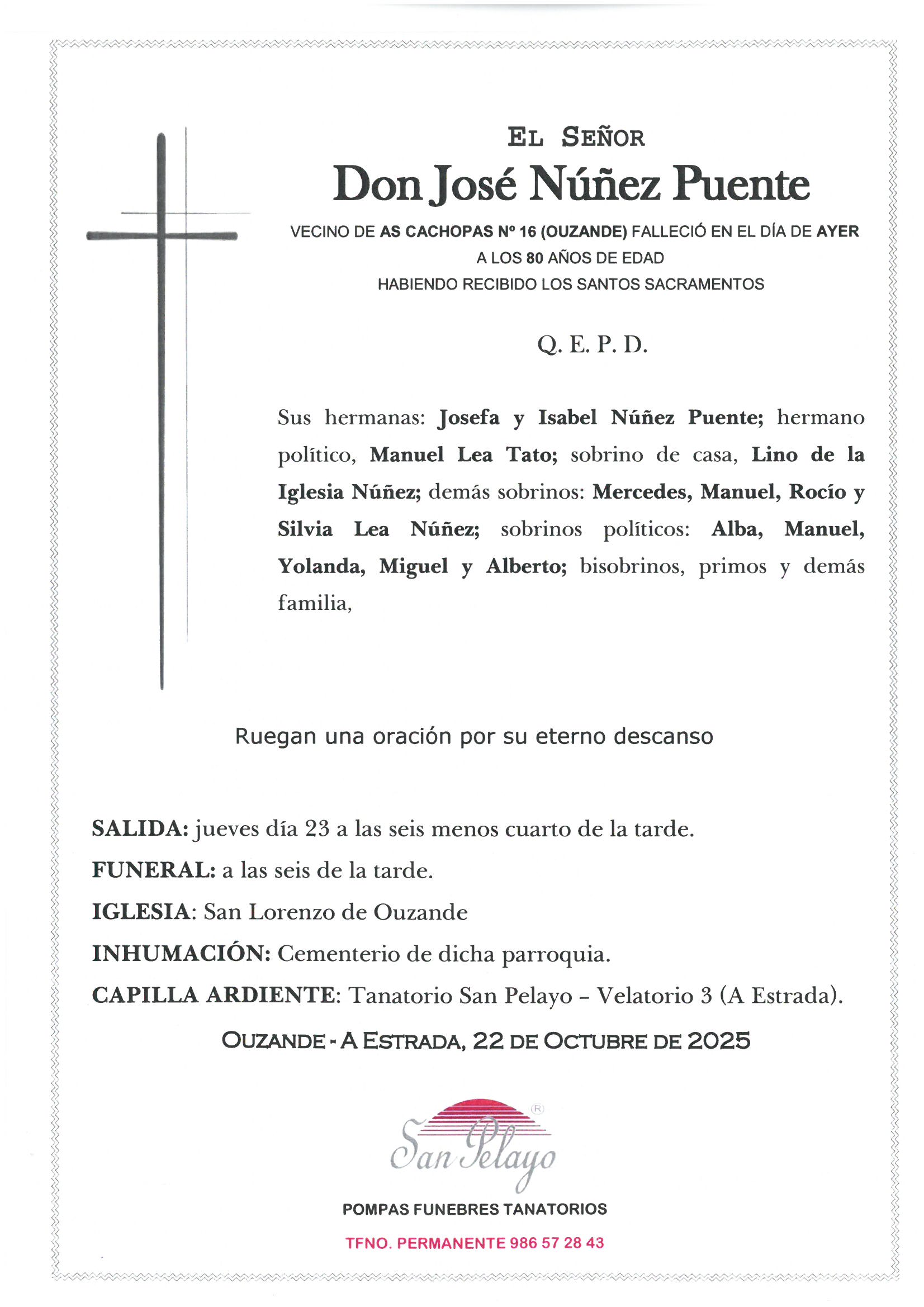 JOSÉ NÚÑEZ PUENTE Funeraria San Pelayo - A EstradaSALA 03 Figueroa de Arriba, 53 Bajo - 36681 A Estrada(ver en mapa) 986 572 843 22/10/202523/10/2025 Archivos adjuntos SOlivetti M25102209040.jpg Eventos 23/10/202518:00 Iglesia y cementerio San Lorenzo de Ouzande Ouzande - A Estrada(ver en mapa) Enviar pésameSu mensaje llegará a la familia de la persona fallecida Pésame para la familia de JOSÉ NÚÑEZ PUENTE Selecciona un mensaje de pésame para cargarlo El motivo de este mensaje es expresarle mis más profundas condolencias por el reciente fallecimiento. Deseo que su alma descanse en paz y que encuentren pronto la resignación por tan enorme pérdida. Nos ha impresionado el reciente fallecimiento. Le acompañamos en su sentimiento ante tan irreparable pérdida. Apenas me acabo de enterar del lamentable fallecimiento. Dios le ayude a soportar tan gran ausencia. Siento sinceramente el reciente fallecimiento. Le envío un fuerte abrazo. Les envío mi más sentido pésame. Les acompaño en su dolor. Una gran persona, ejemplo vital para otras muchas; que su recuerdo permanezca y su trayectoria sea recordada. Condolencias a toda la familia. Mostrar pésames más habituales El titular de la página informa que los datos de este formulario serán tratados para ofrecerle la información solicitada, siendo la base legal del tratamiento el consentimiento otorgado por el usuario. No se cederán datos a terceros. Puede ejercer los derechos como se explica en la Política de Privacidad. Defunción JOSÉ NÚÑEZ PUENTE. Esquela, ubicación tanatorio, funeraria, horarios iglesia y cementerio. Envío de pesames online y servicio de floristería (flores, ramos, coronas, centros florales..) para enviar un último recuerdo y condolencias a la familia de JOSÉ NÚÑEZ PUENTE. Información sobre las misas y el entierro del difunto así como del velatorio y la capilla ardiente.