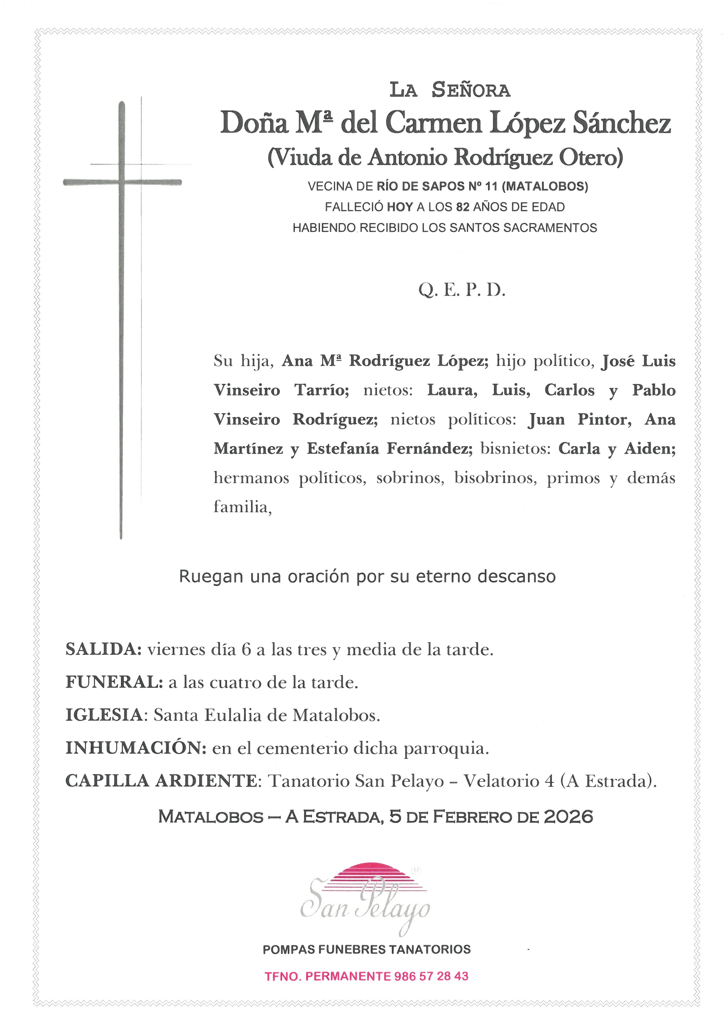 Mª DEL CARMEN LOPEZ SANCHEZ Funeraria San Pelayo - A EstradaSALA 04 Figueroa de Arriba, 53 Bajo - 36681 A Estrada(ver en mapa) 986 572 843 05/02/202606/02/2026 Archivos adjuntos S18091513150.jpg Eventos Iglesia y cementerio Santa Eulalia de Matalobos Matalobos - A Estrada(ver en mapa) Enviar pésameSu mensaje llegará a la familia del fallecido Pésame para la familia de Mª DEL CARMEN LOPEZ SANCHEZ Selecciona un mensaje de pésame para cargarlo El motivo de este mensaje es expresarle mis más profundas condolencias por el reciente fallecimiento. Deseo que su alma descanse en paz y que encuentren pronto la resignación por tan enorme pérdida. Nos ha impresionado el reciente fallecimiento. Le acompañamos en su sentimiento ante tan irreparable pérdida. Apenas me acabo de enterar del lamentable fallecimiento. Dios le ayude a soportar tan gran ausencia. Siento sinceramente el reciente fallecimiento. Le envío un fuerte abrazo. Les envío mi más sentido pésame. Les acompaño en su dolor. Una gran persona, ejemplo vital para otras muchas; que su recuerdo permanezca y su trayectoria sea recordada. Condolencias a toda la familia. Mostrar pésames más habituales El titular de la página informa que los datos de este formulario serán tratados para ofrecerle la información solicitada, siendo la base legal del tratamiento el consentimiento otorgado por el usuario. No se cederán datos a terceros. Puede ejercer los derechos como se explica en la Política de Privacidad. Defunción Mª DEL CARMEN LOPEZ SANCHEZ. Esquela, ubicación tanatorio, funeraria, horarios iglesia y cementerio. Envío de pesames online y servicio de floristería (flores, ramos, coronas, centros florales..) para enviar un último recuerdo y condolencias a la familia de Mª DEL CARMEN LOPEZ SANCHEZ. Información sobre las misas y el entierro del difunto así como del velatorio y la capilla ardiente.