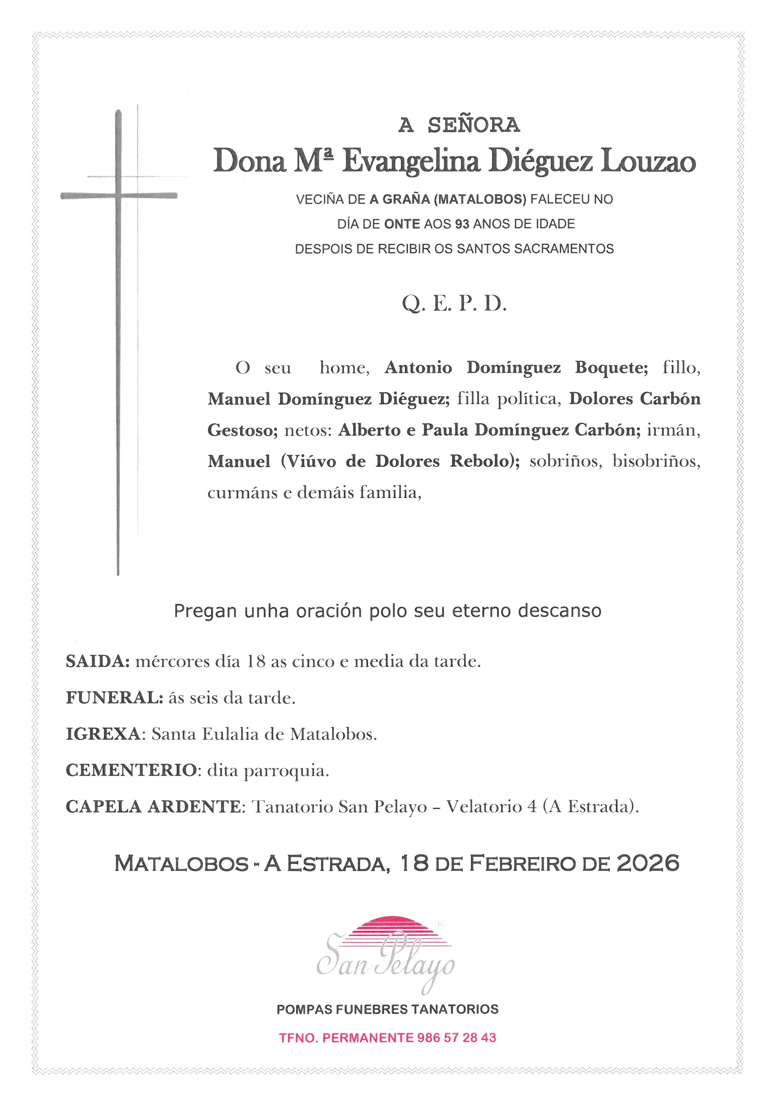 Mª EVANGELINA DIÉGUEZ LOUZAO Funeraria San Pelayo - A EstradaSALA 04 Figueroa de Arriba, 53 Bajo - 36681 A Estrada(ver en mapa) 986 572 843 17/02/202618/02/2026 Archivos adjuntos S18092801110.jpg Eventos 18/02/202618:00 Iglesia y cementerio Santa Eulalia de Matalobos Matalobos - A Estrada(ver en mapa) Enviar pésameSu mensaje llegará a la familia del fallecido Pésame para la familia de Mª EVANGELINA DIÉGUEZ LOUZAO Selecciona un mensaje de pésame para cargarlo El motivo de este mensaje es expresarle mis más profundas condolencias por el reciente fallecimiento. Deseo que su alma descanse en paz y que encuentren pronto la resignación por tan enorme pérdida. Nos ha impresionado el reciente fallecimiento. Le acompañamos en su sentimiento ante tan irreparable pérdida. Apenas me acabo de enterar del lamentable fallecimiento. Dios le ayude a soportar tan gran ausencia. Siento sinceramente el reciente fallecimiento. Le envío un fuerte abrazo. Les envío mi más sentido pésame. Les acompaño en su dolor. Una gran persona, ejemplo vital para otras muchas; que su recuerdo permanezca y su trayectoria sea recordada. Condolencias a toda la familia. Mostrar pésames más habituales El titular de la página informa que los datos de este formulario serán tratados para ofrecerle la información solicitada, siendo la base legal del tratamiento el consentimiento otorgado por el usuario. No se cederán datos a terceros. Puede ejercer los derechos como se explica en la Política de Privacidad. Defunción Mª EVANGELINA DIÉGUEZ LOUZAO. Esquela, ubicación tanatorio, funeraria, horarios iglesia y cementerio. Envío de pesames online y servicio de floristería (flores, ramos, coronas, centros florales..) para enviar un último recuerdo y condolencias a la familia de Mª EVANGELINA DIÉGUEZ LOUZAO. Información sobre las misas y el entierro del difunto así como del velatorio y la capilla ardiente.