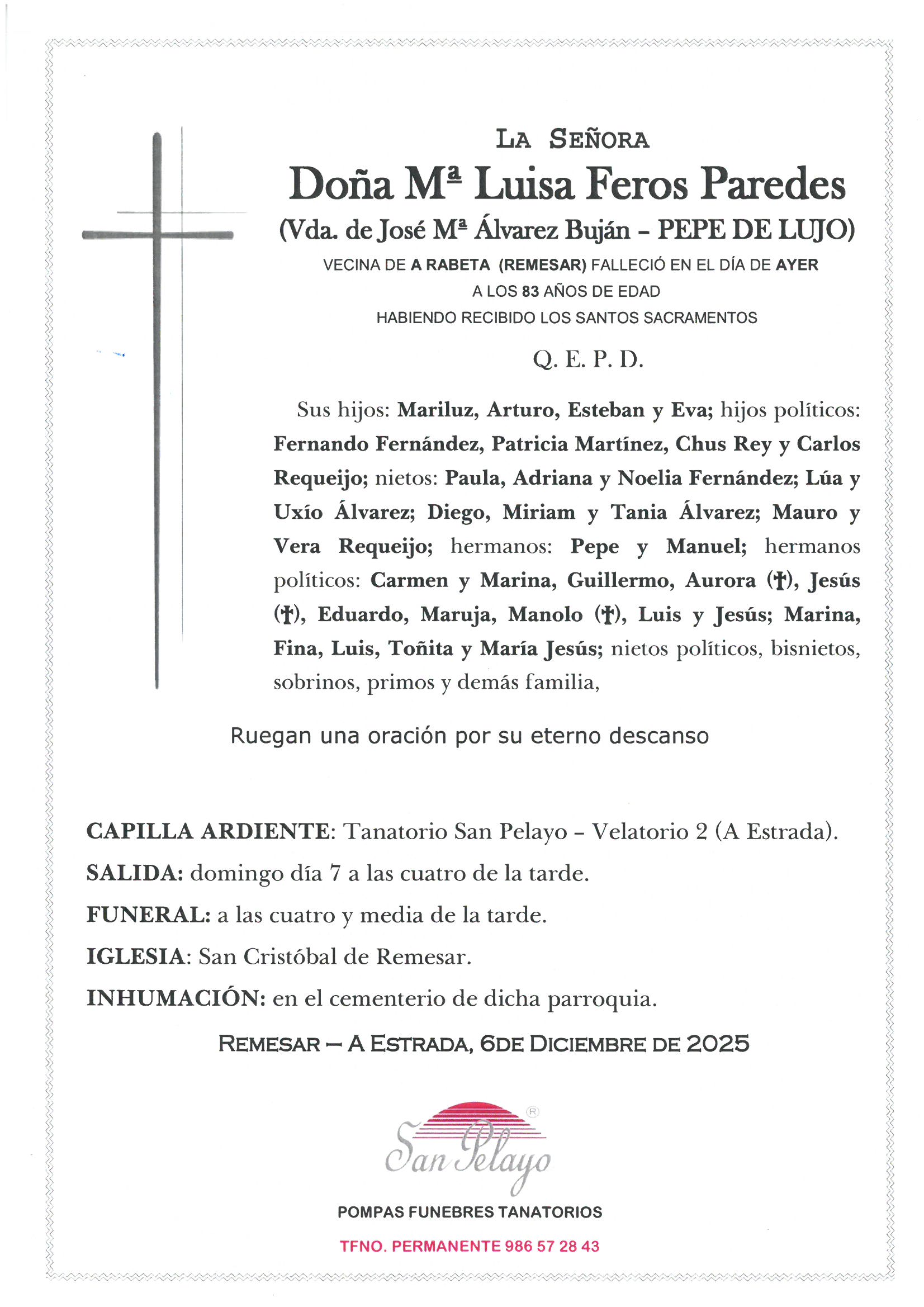Mª LUISA FEROS PAREDES Funeraria San Pelayo - A EstradaSALA 02 Figueroa de Arriba, 53 Bajo - 36681 A Estrada(ver en mapa) 986 572 843 05/12/202507/12/2025 Archivos adjuntos SOlivetti M25120522410.jpg Eventos Iglesia y cementerio San Cristobal de Remesar Remesar - A Estrada(ver en mapa) Enviar pésameSu mensaje llegará a la familia de la persona fallecida Pésame para la familia de Mª LUISA FEROS PAREDES Selecciona un mensaje de pésame para cargarlo El motivo de este mensaje es expresarle mis más profundas condolencias por el reciente fallecimiento. Deseo que su alma descanse en paz y que encuentren pronto la resignación por tan enorme pérdida. Nos ha impresionado el reciente fallecimiento. Le acompañamos en su sentimiento ante tan irreparable pérdida. Apenas me acabo de enterar del lamentable fallecimiento. Dios le ayude a soportar tan gran ausencia. Siento sinceramente el reciente fallecimiento. Le envío un fuerte abrazo. Les envío mi más sentido pésame. Les acompaño en su dolor. Una gran persona, ejemplo vital para otras muchas; que su recuerdo permanezca y su trayectoria sea recordada. Condolencias a toda la familia. Mostrar pésames más habituales El titular de la página informa que los datos de este formulario serán tratados para ofrecerle la información solicitada, siendo la base legal del tratamiento el consentimiento otorgado por el usuario. No se cederán datos a terceros. Puede ejercer los derechos como se explica en la Política de Privacidad. Defunción Mª LUISA FEROS PAREDES. Esquela, ubicación tanatorio, funeraria, horarios iglesia y cementerio. Envío de pesames online y servicio de floristería (flores, ramos, coronas, centros florales..) para enviar un último recuerdo y condolencias a la familia de Mª LUISA FEROS PAREDES. Información sobre las misas y el entierro del difunto así como del velatorio y la capilla ardiente.