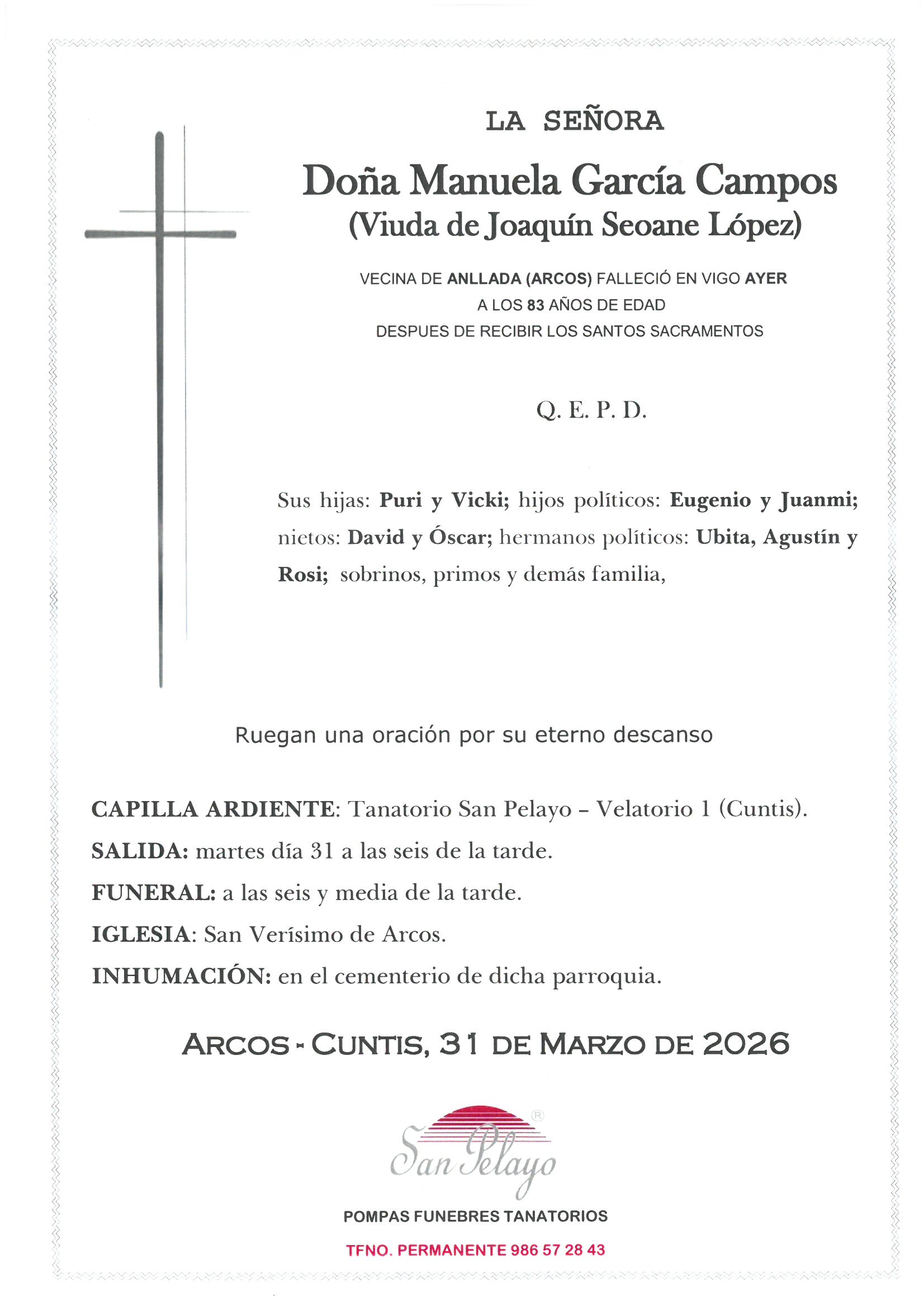 MANUELA GARCIA CAMPOS Funeraria San Pelayo - Cuntis Campo s/n - 36679 Cuntis(ver en mapa) 986 572 843 30/03/202631/03/2026 Archivos adjuntos SOlivetti M26033021360.jpg Eventos 31/03/202618:30 Iglesia y cementerio San Verisimo de Arcos de Furcos Iglesia, Arcos - Cuntis(ver en mapa) Enviar pésameSu mensaje llegará a la familia del fallecido Pésame para la familia de MANUELA GARCIA CAMPOS Selecciona un mensaje de pésame para cargarlo El motivo de este mensaje es expresarle mis más profundas condolencias por el reciente fallecimiento. Deseo que su alma descanse en paz y que encuentren pronto la resignación por tan enorme pérdida. Nos ha impresionado el reciente fallecimiento. Le acompañamos en su sentimiento ante tan irreparable pérdida. Apenas me acabo de enterar del lamentable fallecimiento. Dios le ayude a soportar tan gran ausencia. Siento sinceramente el reciente fallecimiento. Le envío un fuerte abrazo. Les envío mi más sentido pésame. Les acompaño en su dolor. Una gran persona, ejemplo vital para otras muchas; que su recuerdo permanezca y su trayectoria sea recordada. Condolencias a toda la familia. Mostrar pésames más habituales El titular de la página informa que los datos de este formulario serán tratados para ofrecerle la información solicitada, siendo la base legal del tratamiento el consentimiento otorgado por el usuario. No se cederán datos a terceros. Puede ejercer los derechos como se explica en la Política de Privacidad. Defunción MANUELA GARCIA CAMPOS. Esquela, ubicación tanatorio, funeraria, horarios iglesia y cementerio. Envío de pesames online y servicio de floristería (flores, ramos, coronas, centros florales..) para enviar un último recuerdo y condolencias a la familia de MANUELA GARCIA CAMPOS. Información sobre las misas y el entierro del difunto así como del velatorio y la capilla ardiente.