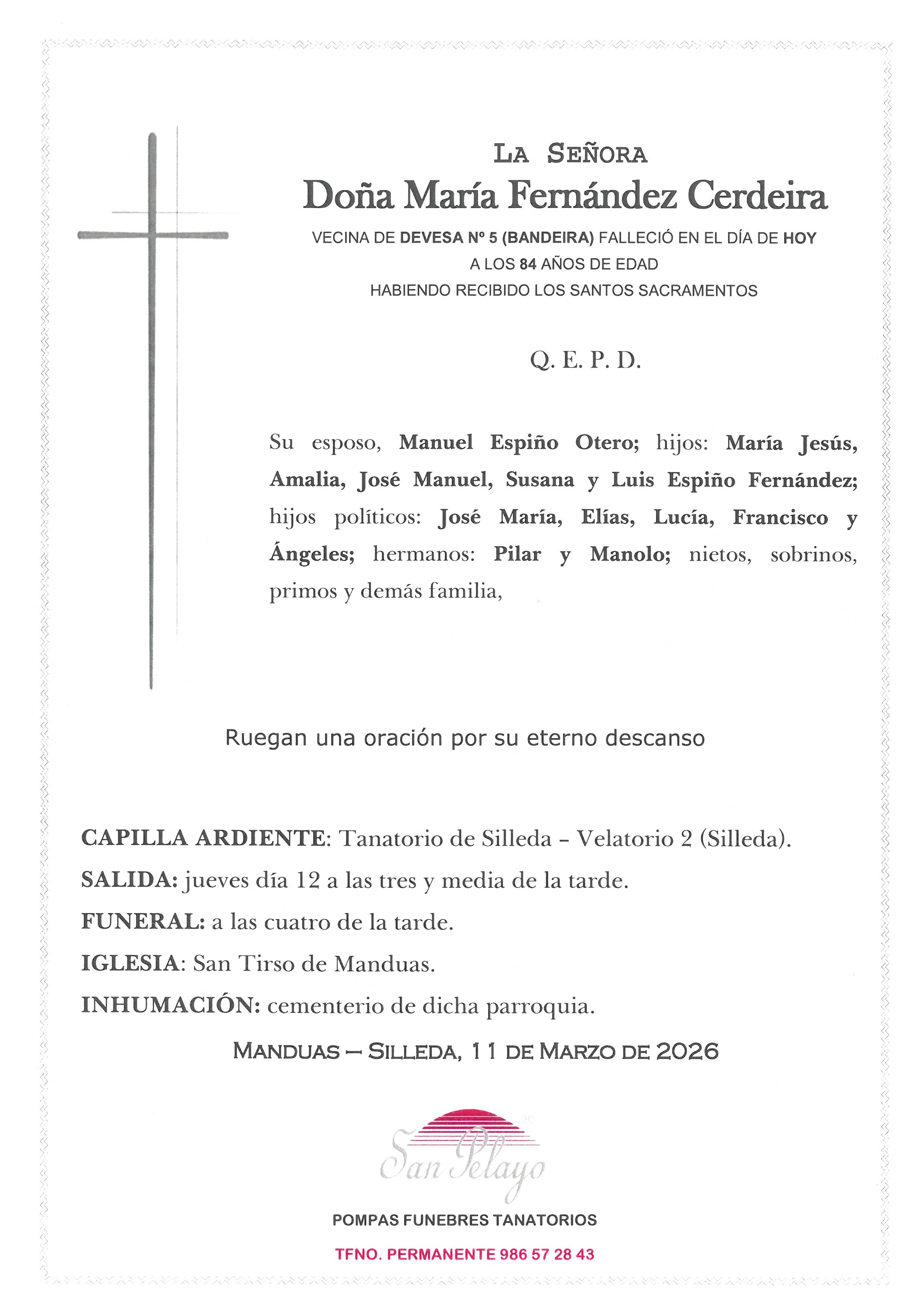 MARIA FERNANDEZ CERDEIRA Tanatorio ExternoCONSULTAR SALA 986 572 843 11/03/202612/03/2026 Archivos adjuntos S18101913181.jpg Eventos 11/03/202610:09 Tanatorio Tanatorio de Silleda Vilanova, 17 - Silleda(ver en mapa) 12/03/202616:00 Iglesia y cementerio San Tirso de Manduas Manduas - Silleda(ver en mapa) Enviar pésameSu mensaje llegará a la familia del fallecido Pésame para la familia de MARIA FERNANDEZ CERDEIRA Selecciona un mensaje de pésame para cargarlo El motivo de este mensaje es expresarle mis más profundas condolencias por el reciente fallecimiento. Deseo que su alma descanse en paz y que encuentren pronto la resignación por tan enorme pérdida. Nos ha impresionado el reciente fallecimiento. Le acompañamos en su sentimiento ante tan irreparable pérdida. Apenas me acabo de enterar del lamentable fallecimiento. Dios le ayude a soportar tan gran ausencia. Siento sinceramente el reciente fallecimiento. Le envío un fuerte abrazo. Les envío mi más sentido pésame. Les acompaño en su dolor. Una gran persona, ejemplo vital para otras muchas; que su recuerdo permanezca y su trayectoria sea recordada. Condolencias a toda la familia. Mostrar pésames más habituales El titular de la página informa que los datos de este formulario serán tratados para ofrecerle la información solicitada, siendo la base legal del tratamiento el consentimiento otorgado por el usuario. No se cederán datos a terceros. Puede ejercer los derechos como se explica en la Política de Privacidad. Defunción MARIA FERNANDEZ CERDEIRA. Esquela, ubicación tanatorio, funeraria, horarios iglesia y cementerio. Envío de pesames online y servicio de floristería (flores, ramos, coronas, centros florales..) para enviar un último recuerdo y condolencias a la familia de MARIA FERNANDEZ CERDEIRA. Información sobre las misas y el entierro del difunto así como del velatorio y la capilla ardiente.