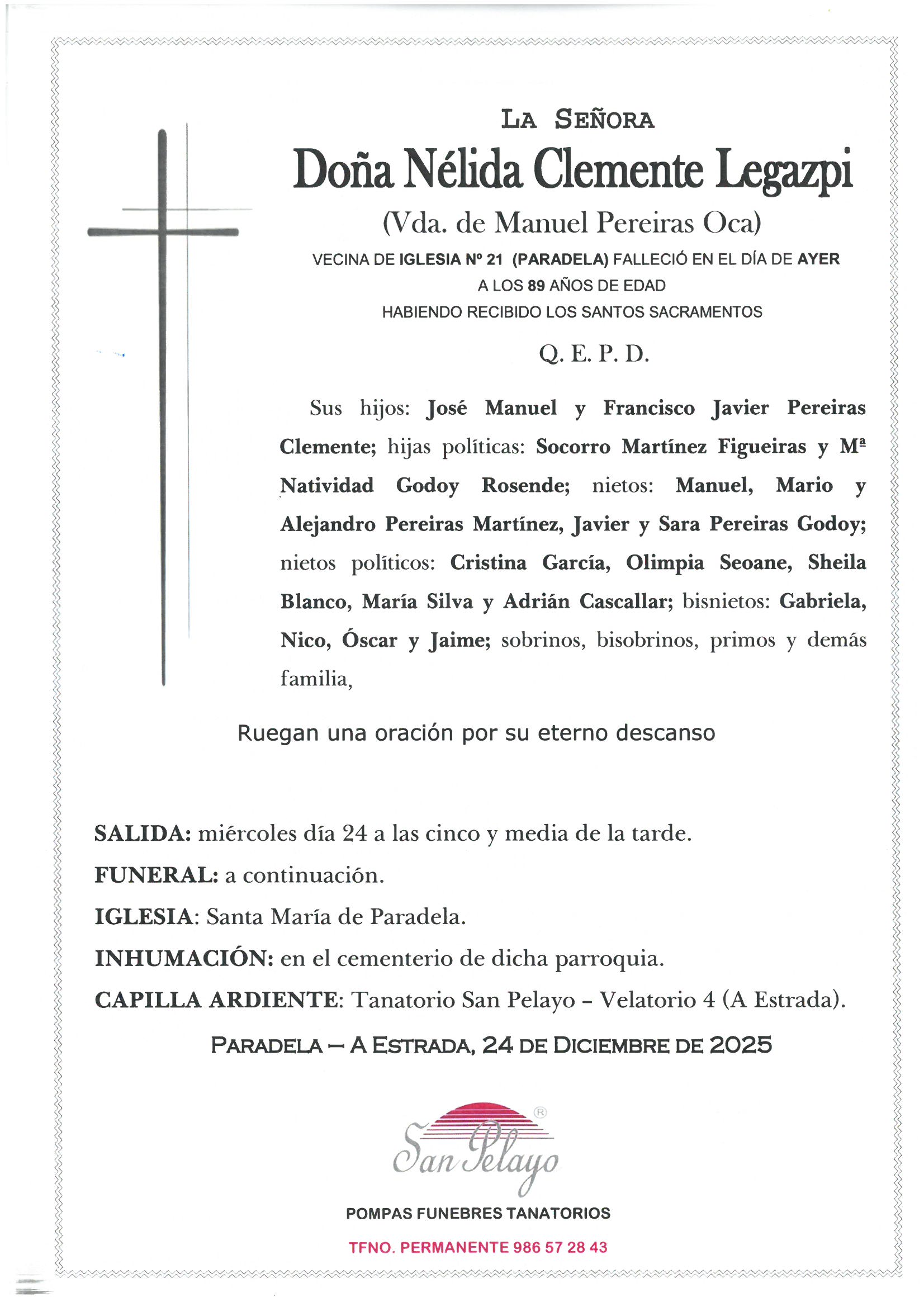 NÉLIDA CLEMENTE LEGAZPI Funeraria San Pelayo - A EstradaSALA 04 Figueroa de Arriba, 53 Bajo - 36681 A Estrada(ver en mapa) 986 572 843 24/12/202524/12/2025 Archivos adjuntos SOlivetti M25122409260.jpg Eventos 24/12/202518:00 Iglesia y cementerio Santa Maria de Paradela Iglesia - A Estrada(ver en mapa) Enviar pésameSu mensaje llegará a la familia de la persona fallecida Pésame para la familia de NÉLIDA CLEMENTE LEGAZPI Selecciona un mensaje de pésame para cargarlo El motivo de este mensaje es expresarle mis más profundas condolencias por el reciente fallecimiento. Deseo que su alma descanse en paz y que encuentren pronto la resignación por tan enorme pérdida. Nos ha impresionado el reciente fallecimiento. Le acompañamos en su sentimiento ante tan irreparable pérdida. Apenas me acabo de enterar del lamentable fallecimiento. Dios le ayude a soportar tan gran ausencia. Siento sinceramente el reciente fallecimiento. Le envío un fuerte abrazo. Les envío mi más sentido pésame. Les acompaño en su dolor. Una gran persona, ejemplo vital para otras muchas; que su recuerdo permanezca y su trayectoria sea recordada. Condolencias a toda la familia. Mostrar pésames más habituales El titular de la página informa que los datos de este formulario serán tratados para ofrecerle la información solicitada, siendo la base legal del tratamiento el consentimiento otorgado por el usuario. No se cederán datos a terceros. Puede ejercer los derechos como se explica en la Política de Privacidad. Defunción NÉLIDA CLEMENTE LEGAZPI. Esquela, ubicación tanatorio, funeraria, horarios iglesia y cementerio. Envío de pesames online y servicio de floristería (flores, ramos, coronas, centros florales..) para enviar un último recuerdo y condolencias a la familia de NÉLIDA CLEMENTE LEGAZPI. Información sobre las misas y el entierro del difunto así como del velatorio y la capilla ardiente.