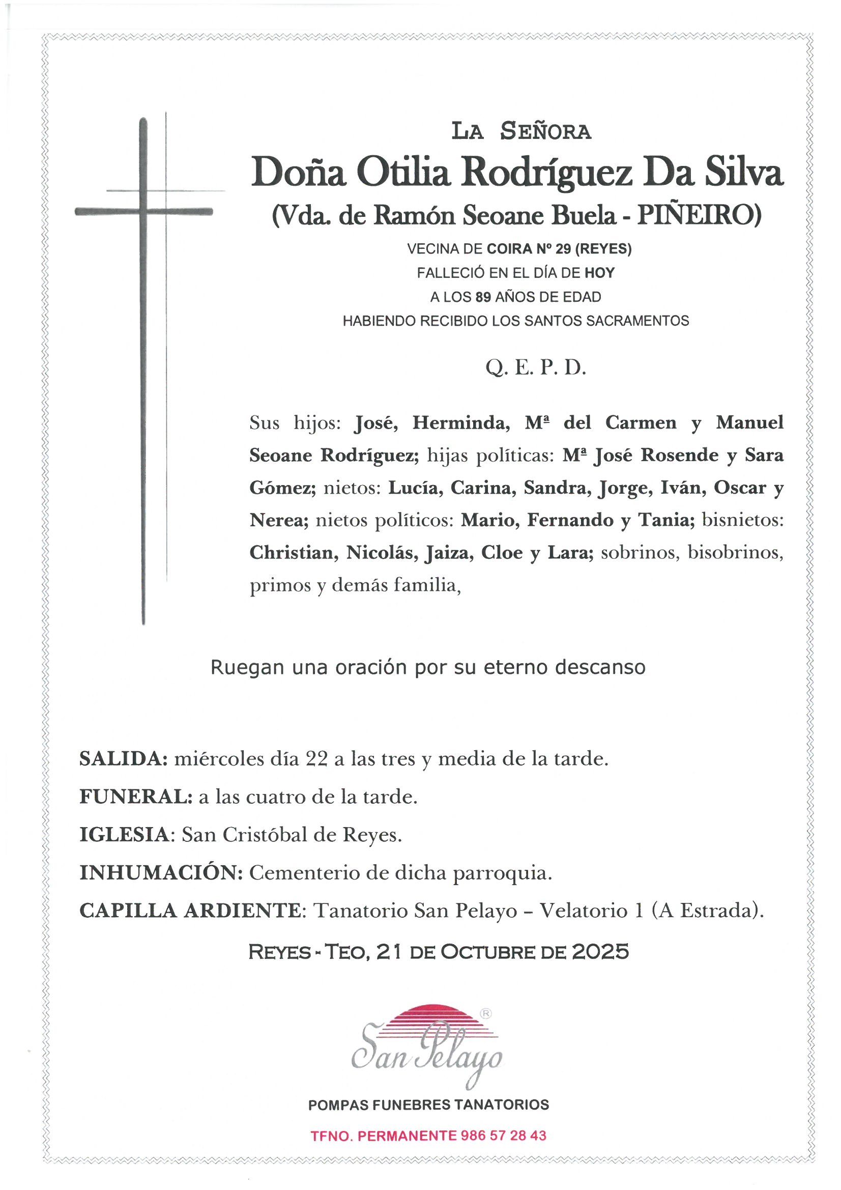 OTILIA RODRIGUEZ DA SILVA Funeraria San Pelayo - A EstradaSALA 01 Figueroa de Arriba, 53 Bajo - 36681 A Estrada(ver en mapa) 986 572 843 21/10/202522/10/2025 Archivos adjuntos SOlivetti M25102112390.jpg Eventos Iglesia y cementerio San Cristobal de Reis Camiño da Iglesia - Teo(ver en mapa) Enviar pésameSu mensaje llegará a la familia de la persona fallecida Pésame para la familia de OTILIA RODRIGUEZ DA SILVA Selecciona un mensaje de pésame para cargarlo El motivo de este mensaje es expresarle mis más profundas condolencias por el reciente fallecimiento. Deseo que su alma descanse en paz y que encuentren pronto la resignación por tan enorme pérdida. Nos ha impresionado el reciente fallecimiento. Le acompañamos en su sentimiento ante tan irreparable pérdida. Apenas me acabo de enterar del lamentable fallecimiento. Dios le ayude a soportar tan gran ausencia. Siento sinceramente el reciente fallecimiento. Le envío un fuerte abrazo. Les envío mi más sentido pésame. Les acompaño en su dolor. Una gran persona, ejemplo vital para otras muchas; que su recuerdo permanezca y su trayectoria sea recordada. Condolencias a toda la familia. Mostrar pésames más habituales El titular de la página informa que los datos de este formulario serán tratados para ofrecerle la información solicitada, siendo la base legal del tratamiento el consentimiento otorgado por el usuario. No se cederán datos a terceros. Puede ejercer los derechos como se explica en la Política de Privacidad. Defunción OTILIA RODRIGUEZ DA SILVA. Esquela, ubicación tanatorio, funeraria, horarios iglesia y cementerio. Envío de pesames online y servicio de floristería (flores, ramos, coronas, centros florales..) para enviar un último recuerdo y condolencias a la familia de OTILIA RODRIGUEZ DA SILVA. Información sobre las misas y el entierro del difunto así como del velatorio y la capilla ardiente.