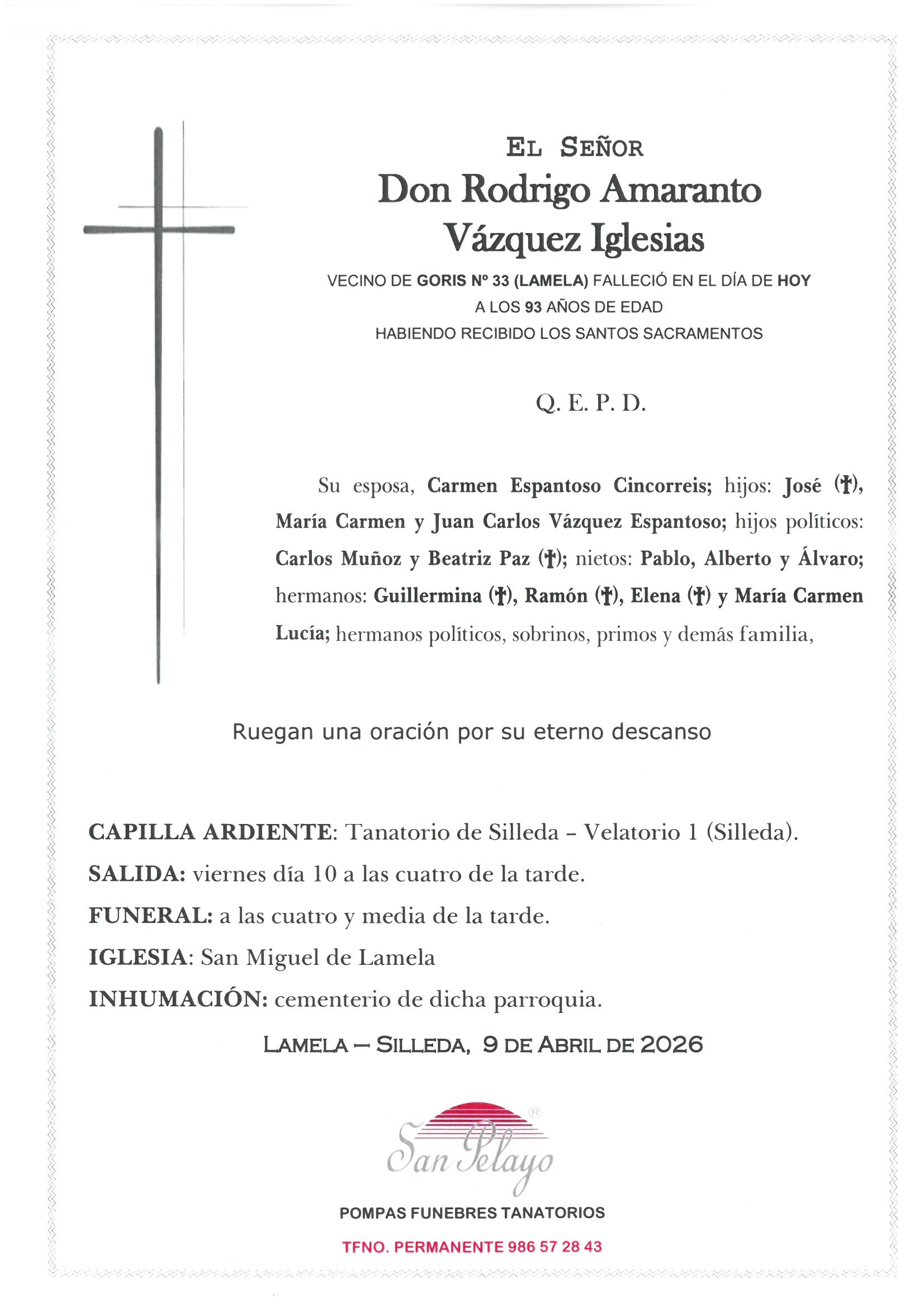 RODRIGO AMARANTO VÁZQUEZ IGLESIAS Tanatorio ExternoCONSULTAR SALA 986 572 843 09/04/202610/04/2026 Archivos adjuntos SOlivetti M26040917280.jpg Eventos 10/04/202616:30 Iglesia y cementerio San Miguel de Lamela Lamela - Silleda(ver en mapa) Tanatorio Tanatorio de Silleda Vilanova, 17 - Silleda(ver en mapa) Enviar pésameSu mensaje llegará a la familia del fallecido Pésame para la familia de RODRIGO AMARANTO VÁZQUEZ IGLESIAS Selecciona un mensaje de pésame para cargarlo El motivo de este mensaje es expresarle mis más profundas condolencias por el reciente fallecimiento. Deseo que su alma descanse en paz y que encuentren pronto la resignación por tan enorme pérdida. Nos ha impresionado el reciente fallecimiento. Le acompañamos en su sentimiento ante tan irreparable pérdida. Apenas me acabo de enterar del lamentable fallecimiento. Dios le ayude a soportar tan gran ausencia. Siento sinceramente el reciente fallecimiento. Le envío un fuerte abrazo. Les envío mi más sentido pésame. Les acompaño en su dolor. Una gran persona, ejemplo vital para otras muchas; que su recuerdo permanezca y su trayectoria sea recordada. Condolencias a toda la familia. Mostrar pésames más habituales El titular de la página informa que los datos de este formulario serán tratados para ofrecerle la información solicitada, siendo la base legal del tratamiento el consentimiento otorgado por el usuario. No se cederán datos a terceros. Puede ejercer los derechos como se explica en la Política de Privacidad. Defunción RODRIGO AMARANTO VÁZQUEZ IGLESIAS. Esquela, ubicación tanatorio, funeraria, horarios iglesia y cementerio. Envío de pesames online y servicio de floristería (flores, ramos, coronas, centros florales..) para enviar un último recuerdo y condolencias a la familia de RODRIGO AMARANTO VÁZQUEZ IGLESIAS. Información sobre las misas y el entierro del difunto así como del velatorio y la capilla ardiente.