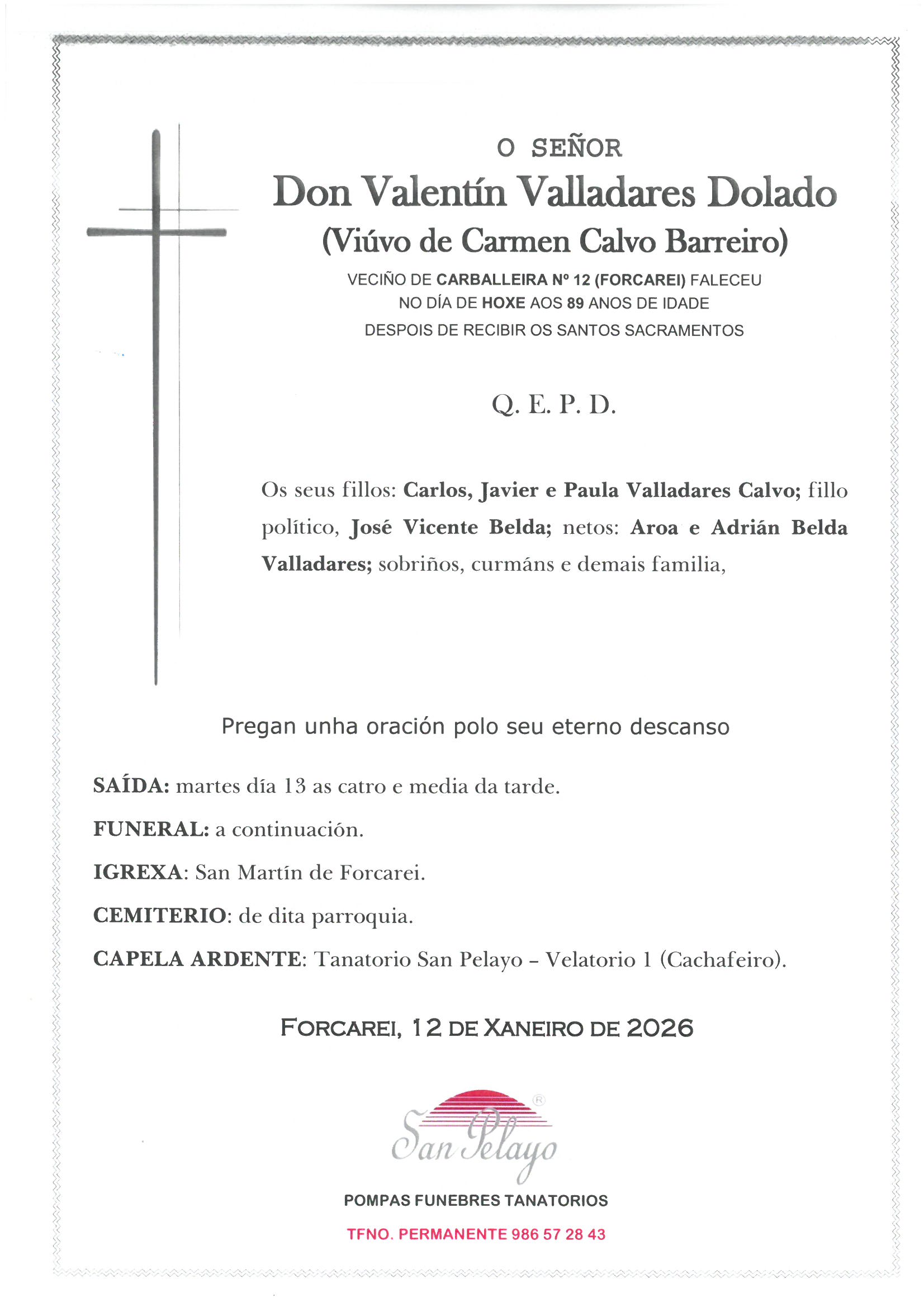 VALENTIN VALLADARES DOLADO Funeraria San Pelayo - ForcareiSALA 01 Cachafeiro s/n - 36550 Forcarei(ver en mapa) 986 572 843 12/01/202613/01/2026 Archivos adjuntos SOlivetti M26011216510.jpg Eventos Iglesia San Martin de Forcarei Forcarei - Forcarei(ver en mapa) Cementerio Municipal de Forcarei Rua Cementerio s/n - Forcarei(ver en mapa) Enviar pésameSu mensaje llegará a la familia de la persona fallecida Pésame para la familia de VALENTIN VALLADARES DOLADO Selecciona un mensaje de pésame para cargarlo El motivo de este mensaje es expresarle mis más profundas condolencias por el reciente fallecimiento. Deseo que su alma descanse en paz y que encuentren pronto la resignación por tan enorme pérdida. Nos ha impresionado el reciente fallecimiento. Le acompañamos en su sentimiento ante tan irreparable pérdida. Apenas me acabo de enterar del lamentable fallecimiento. Dios le ayude a soportar tan gran ausencia. Siento sinceramente el reciente fallecimiento. Le envío un fuerte abrazo. Les envío mi más sentido pésame. Les acompaño en su dolor. Una gran persona, ejemplo vital para otras muchas; que su recuerdo permanezca y su trayectoria sea recordada. Condolencias a toda la familia. Mostrar pésames más habituales El titular de la página informa que los datos de este formulario serán tratados para ofrecerle la información solicitada, siendo la base legal del tratamiento el consentimiento otorgado por el usuario. No se cederán datos a terceros. Puede ejercer los derechos como se explica en la Política de Privacidad. Defunción VALENTIN VALLADARES DOLADO. Esquela, ubicación tanatorio, funeraria, horarios iglesia y cementerio. Envío de pesames online y servicio de floristería (flores, ramos, coronas, centros florales..) para enviar un último recuerdo y condolencias a la familia de VALENTIN VALLADARES DOLADO. Información sobre las misas y el entierro del difunto así como del velatorio y la capilla ardiente.